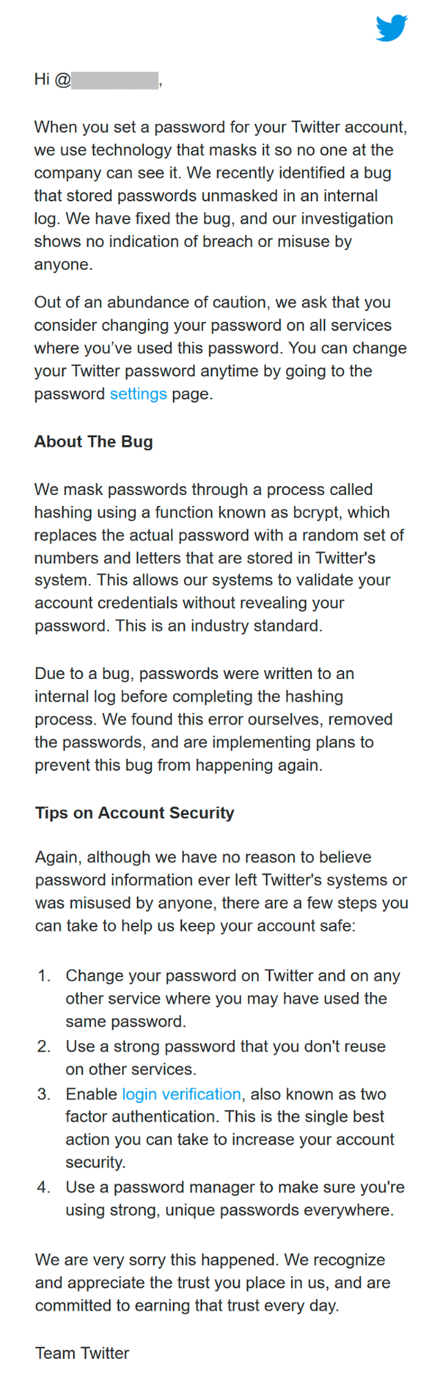 When we talk about professional apology letters, it means that they have a human face in them. It is extremely important to make it clear to the person to whom your “sorry” is addressed that you are not ignoring what happened. On the contrary, you are ready to do everything possible to fix the situation. A good letter should explain what happened. It’s like a confession. Just kidding! But you have to write what caused the screw-up. Whether the system failed or the employee was not himself that day. Here, accuracy, sincerity, and informality are essential. As an example, one of the great apology letters from Twitter, where the social network apologizes for a bug that (albeit for a short time) threatened users’ confidential data. Everything in the letter is done correctly and humanely: