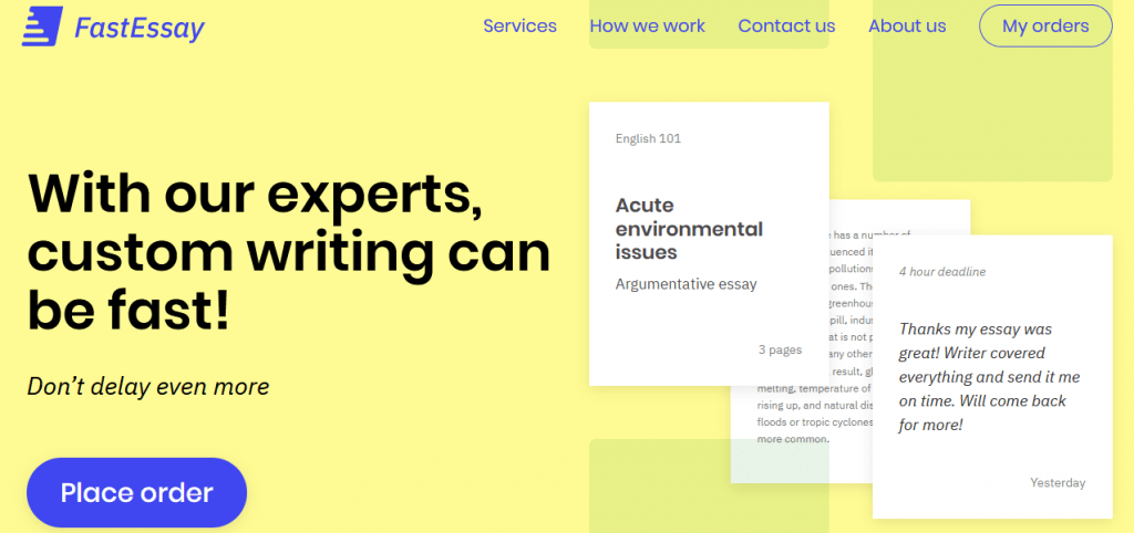 In addition to a special promo code, the customers of FastEssay.net are guaranteed access to free revisions performed by the company experts. It means every writer working for the service takes responsibility for his or her work. In case the client is not 100% satisfied with the quality of the final product and looking for some improvement to be made, he or she is welcome to approach the company managers and ask to fix the mistakes.